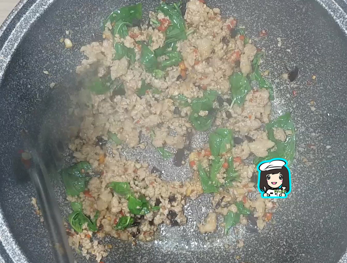ใส่ใบโหระพาลงไป เร่งไฟผัดจนใบโหระพาสลบ ปิดไฟได้