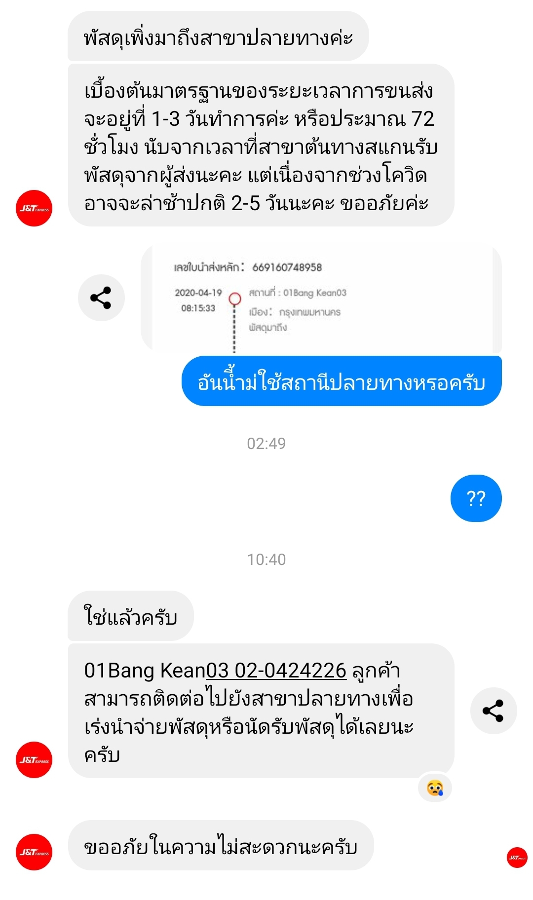 ก็เลยทักไปหา messenger ในเฟสบุค เค้าบอกว่าของเพิ่งถึงสถานีปลายทาง ผมเลยถามว่า อ่าวไม่ใช่ถึงตั้งแต่ 19 แล้วหรอพร้อบแคปรูปไปให้ดู แต่ไม่ตอบจนผมต้องทักไปว่า "??" อีกรอบ admin เลยให้เบอร์สาขามา