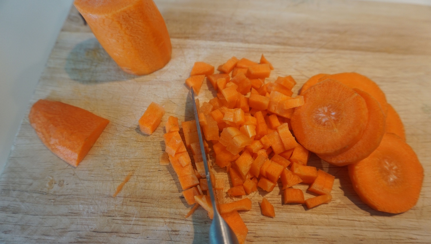 เตรียมทำนํ้าราดหั่นแครอทให้เป็นลูกเต๋าจ้า หั่นเเต่เเครอทพอนะส่วนนิ้วของเราเก็บเอาไว้55