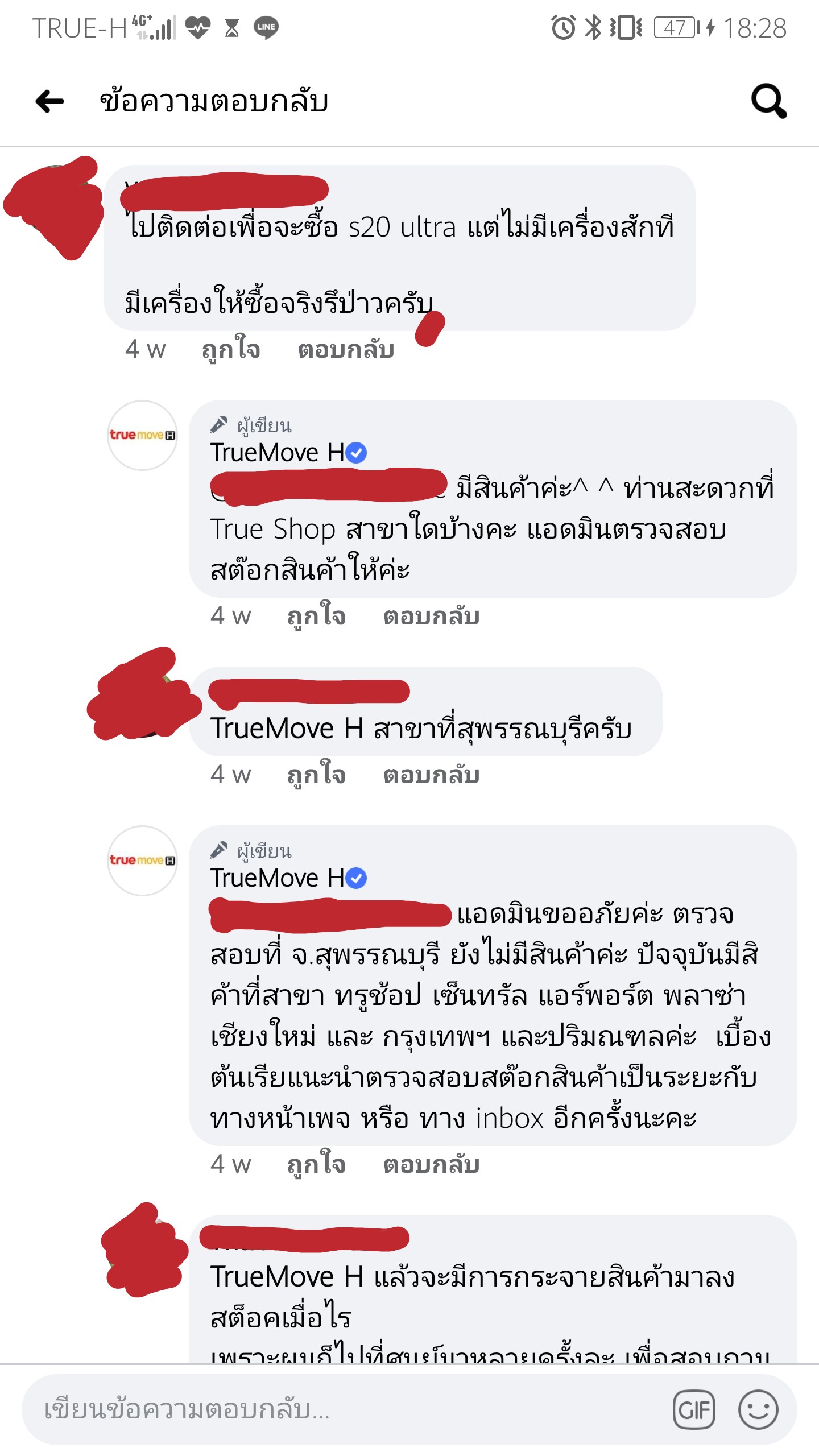 เลยติดต่อไปทางเพจ truemove ก็ได้คำตอบเพียงแค่ จะเช็คสต๊อกของให้ หรือไม่ก็ถามกลับมาว่าลูกค้าสะดวกเดินทางไปสาขาไหนบ้าง (ในช่วงสถานการณ์ที่ โควิด-19 ระบาด)