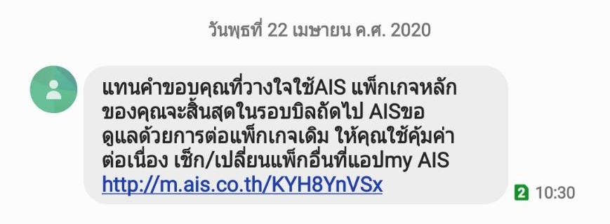 เเต่จู่ๆวันนี้ เวลา 10.30. ก้มีข้อความาว่า AIS ขอดูเเลด้วยการต่อเเพ็กเกจเดิม ให้คุณใช้คุ่มค่าต่อเนื่อง เเล้วก็ระบุ URL ผมก็งงสิครับ เพระาผมมไ้กดสมัครต่อ เเละผมมีเเผนว่าจะยกเลิกจากAIS รายเดือนไปเป็นเติมเงิน