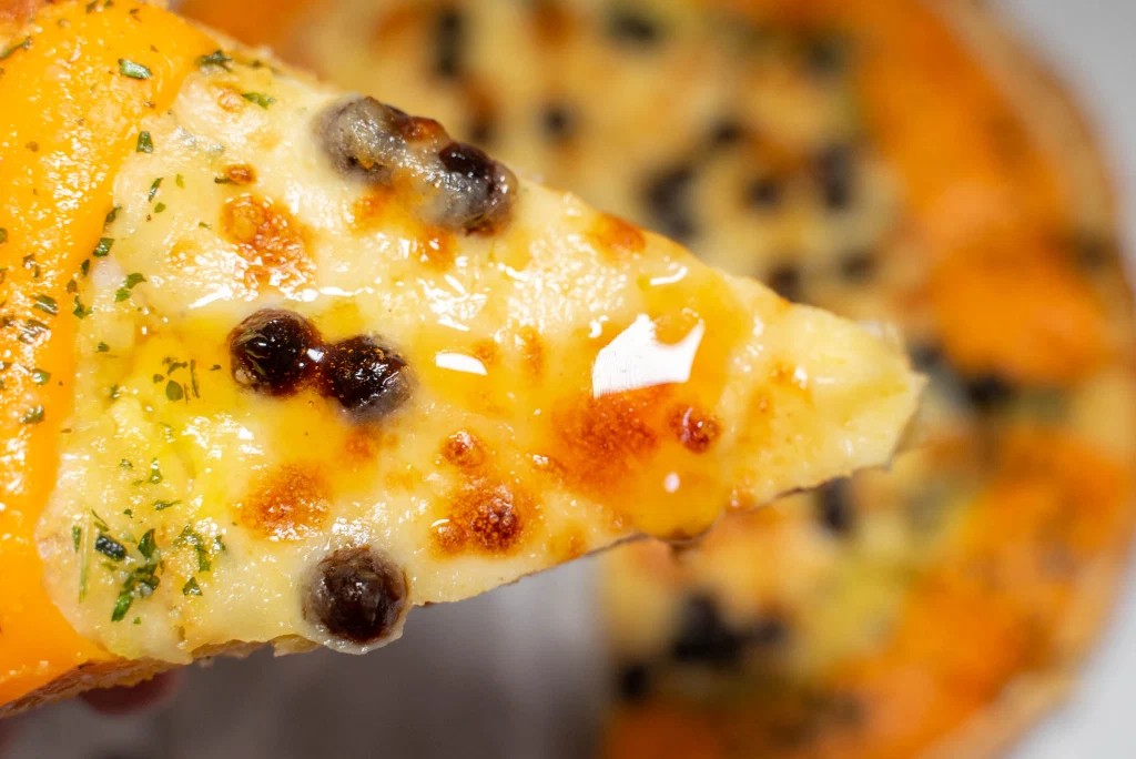 🍕 จากภาพจะเห็นได้ว่าไข่มุกอยู่บนหน้าพิซซ่า จะมีชีสเคลือบอยู่ด้วย นั่นก็แปลว่าทางร้านได้ใส่ไข่มุกลงไปก่อนที่จะนำไปอบ ไม่ได้แค่เอาไข่มุกมาโรยหน้าทีหลัง แสดงให้เห็นถึงความพิถีพิถันในกระบวนการทำพิซซ่าหน้านี้