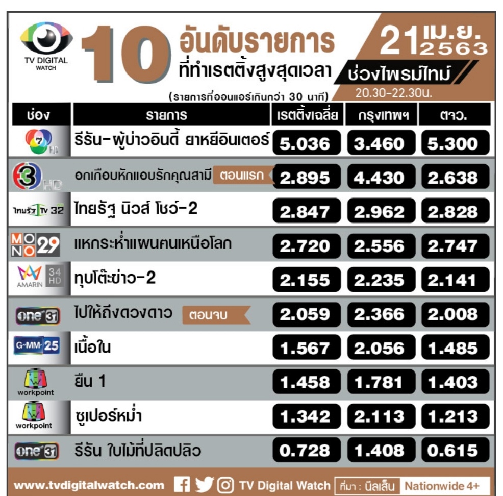เรตติ้งละคร 21 เมษายน แบบแบ่งเขต