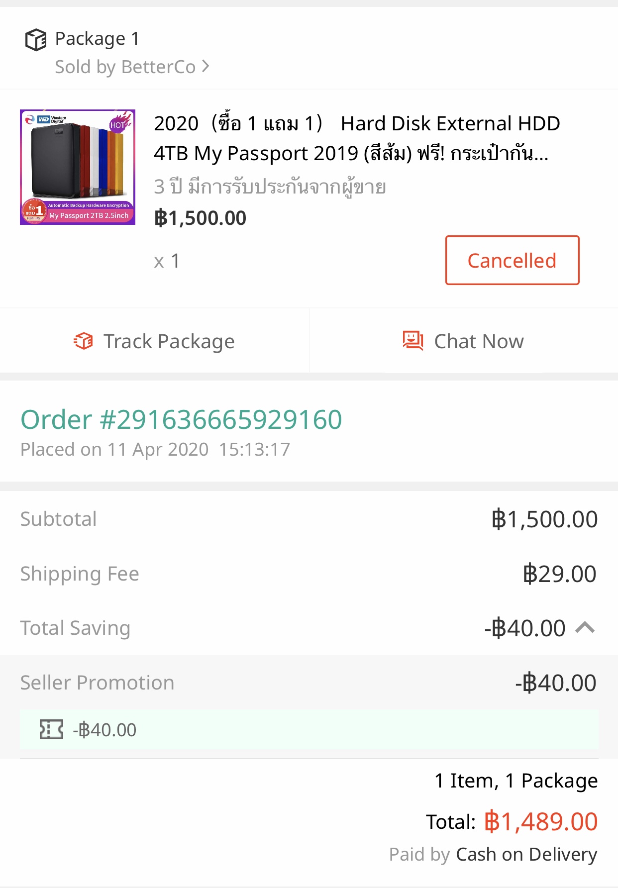 เราสั่งของจากลาซาด้า เป็นexternal hard disk 2 TB ของ WB 1 แถม 1 ทางร้านมีเฉพาะเก็บเงินปลายทางเท่านั้น!!!!!!!!! สุทธิราคา 1489 บาท