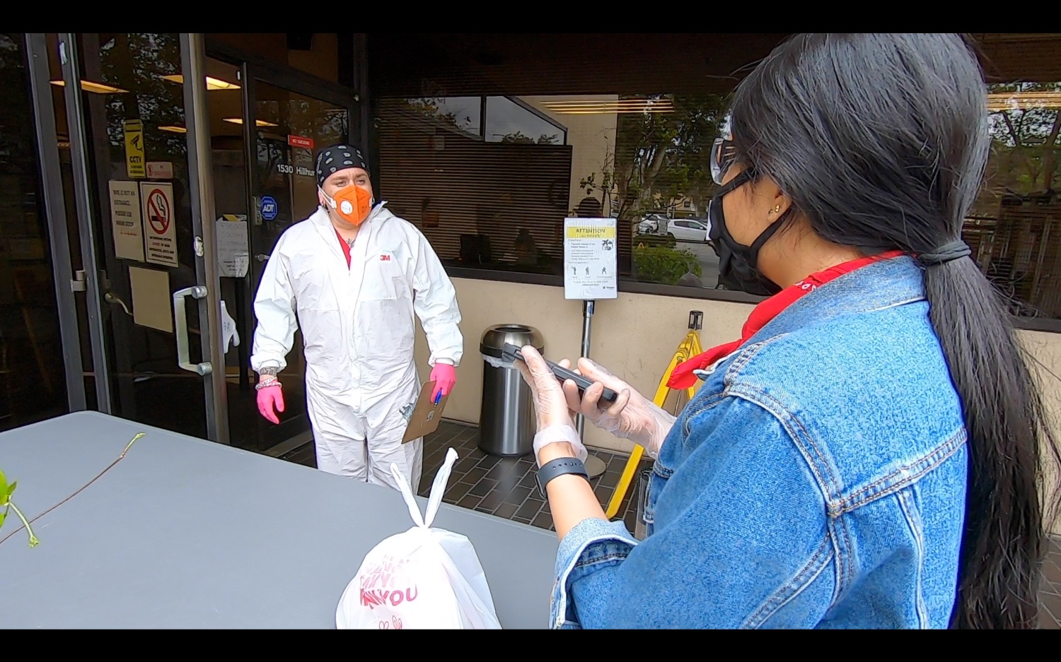 เริ่มด้วยภาพแรกเรามาส่งอาหารที่ศูนย์สุขภาพ เขาไม่ให้เราเข้าไป เอาโต๊ะมาขวางด้านหน้า แล้วให้วางของฝากไว้ตรงนี้คะ