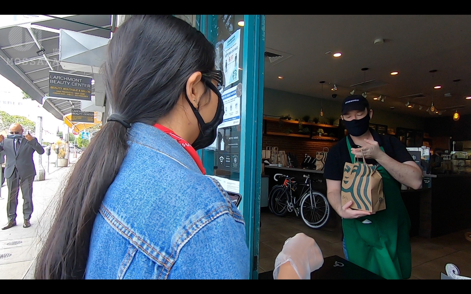 ร้านสตาบัคก็เอาโต๊ะมาขวางประตู คนที่จะสั่งเครื่องดื่มต้องสั่งผ่านมือถือเท่านั้น แล้วมารับตรงนี้ ไม่รับสั่งเครื่องดื่มที่ร้านคะ