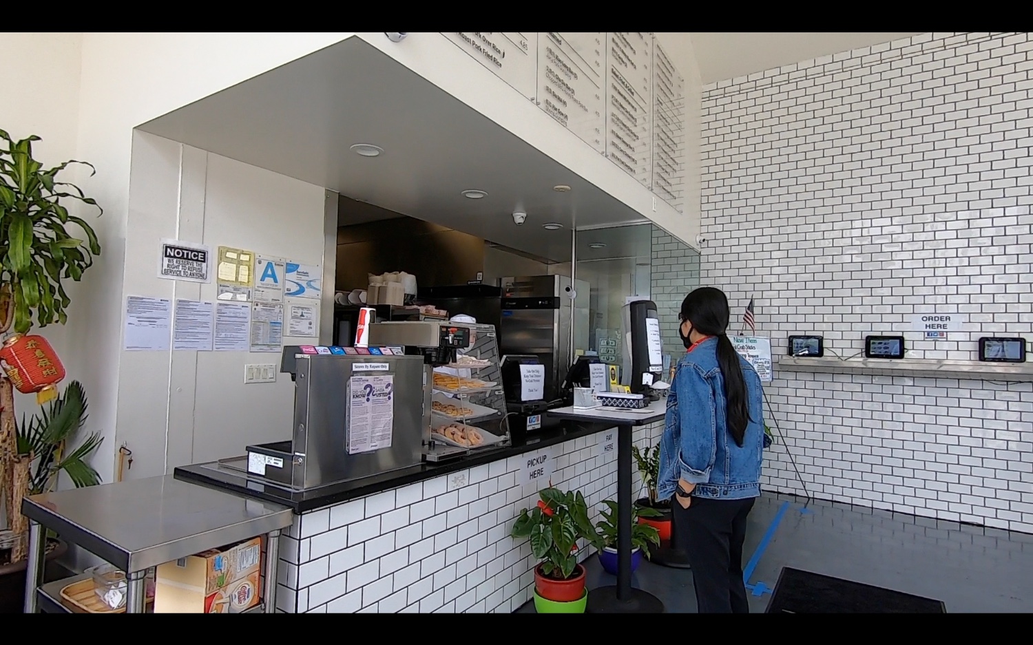 มารับอาหารร้านขายอาหารจีนวางขายคล้ายๆข้าวแกง เขาทำที่กั้นพลาสติกสูงและมีสัญลักษ์ที่พื้นให้ยืนห่างกัน 6 ฟุตตามคำสั่งของทางการคะ
