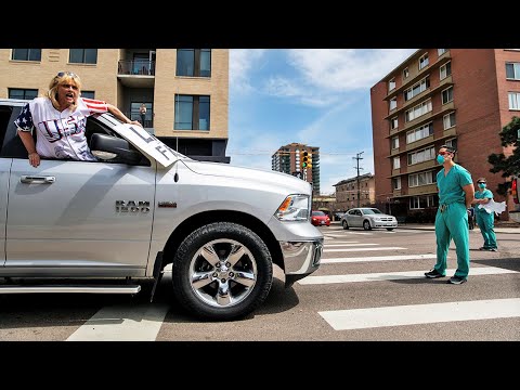 สองสามีภรรยาซึ่งใส่ชุดกาวน์และสวมหน้ากากอนามัย ชูป้ายหันหน้าเข้าหาพวกผู้ประท้วง ซึ่งเขียนข้อความเตือนสติผู้ชุมนุมตรงๆว่า “คุณไม่มีสิทธิ์เอาชีวิตเราไปเสี่ยง กลับบ้านไปซะ!”