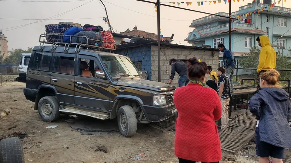 ความเป็นจริง มีคนมารับตี 4.30 รถJeepออกตี 5 วนรับคนอื่นๆอีก 10 คน ทั้งเด็กและผู้ใหญ่ทั้งคันรวม 13 คนรวมคนขับ ตอนแรกคิดว่าเดี๋ยวคงไปเปลี่ยนรถ ปล่าวจ้า ตอนนี้ 7.30 am ยังคงอยู่ในเมือง พึ่งรับคนเสร็จ นั่งกันโคตรเบียด รถก็เสียต้องมาจอดซ่อม เลยได้นั่งกินชาคุยกับคนเนปาลคนอื่นๆจึงรู้ว่า เราไปรถคันนี้นี่แหละ อีก 10 ชั่วโมงถึงที่หมาย ตอนนี้เลทมากๆเพราะมัวแต่รับคนและรถเสีย และทุกคนจ่ายค่ารถ 2200 รูปีเท่ากันทั้งหมด