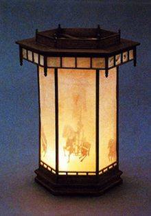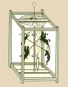 เงาของโคมหมุนเปลี่ยนด้วยไอร้อนจากเทียนขับหมุนกังหันที่เป็นแกนของภาพ