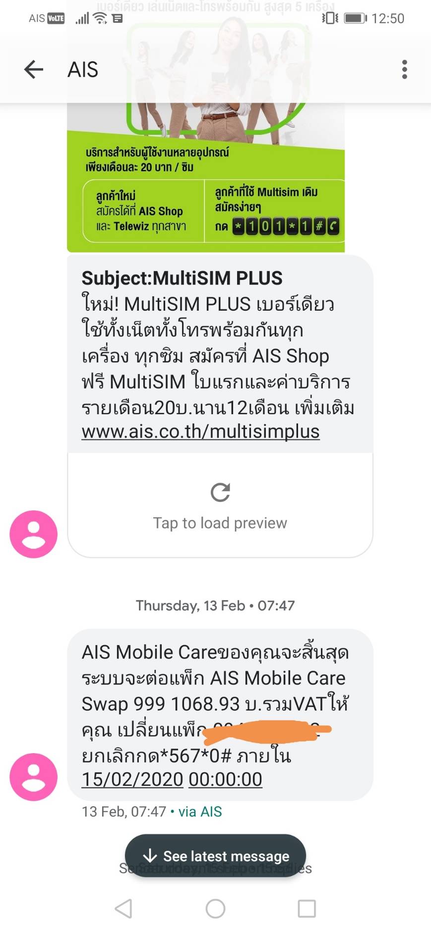 เบื้องต้นโทรไปสอบถาม AIS Mobilecare เค้าบอกว่ามีการแจ้งเตือนทาง SMS ก่อนต่อ Mobile care อัติโนมัติ ซึ่งพอไปตรวจสอบมีการแจ้งเตือนจริงๆ แต่ล่วงหน้าประมาณ 10 วัน เราว่าช่วงเวลาแบบนี้มันสั้นเกินไป และไม่มีการโทรแจ้งใดๆ ทำให้เรารู้สึกว่ามันไม่ค่อยถูกต้องที่จะแจ้งเตือนในระยะเวลาแค่ 10 วัน และเลือกช่องทางที่ส่ง SMS เท่านั้น