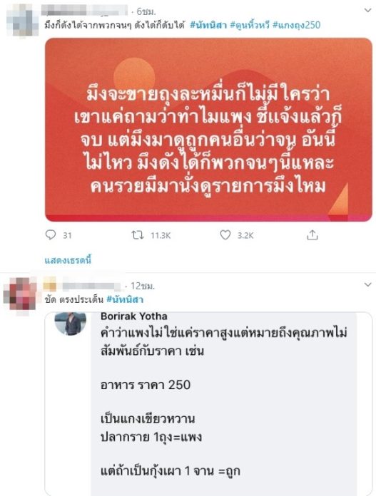 ทัวร์ลง นัทนิสา และ ตูน หิ้วหวี เหยียดคนจน ปมดราม่าแกงถุงละ 250 บาท หลังคุณแม่ของสาว "นัท นิสามณี" เน็ตไอดอล ยูทูบเบอร์และบิวตี้บล็อกเกอร์ชื่อดัง สมาชิกแก๊ง "หิ้วหวี" ทำ "แกงเขียวหวาน" ขายราคา 250 บาท จนมีดราม่า #แกงเขียวหวานราคา250แพงเกินไป