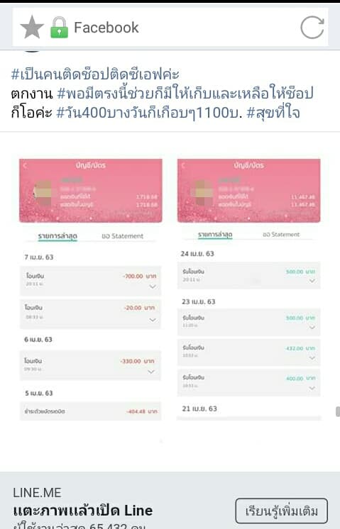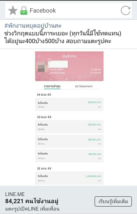 คือเราเห็นใน feed facebook บ่อยมากๆ ไม่ทราบว่าเป็นงานอะไร เห็นมีเงินเข้าร้อยสองร้อยตามรูปที่เขาเอามาโฆษณา เราไม่กล้าแอดไลน์ไปสอบถามข้อมูล รบกวนขอข้อมูลด้วยค่ะ ขอบคุณค่ะ
