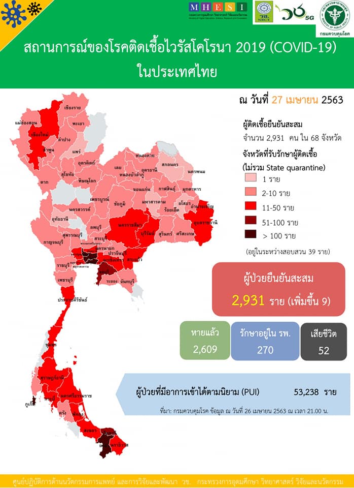 ผู้ติดเชื้อสะสม 2,931 ราย ใน 68 จังหวัด (เพิ่มขึ้นในวันนี้ 9 ราย)