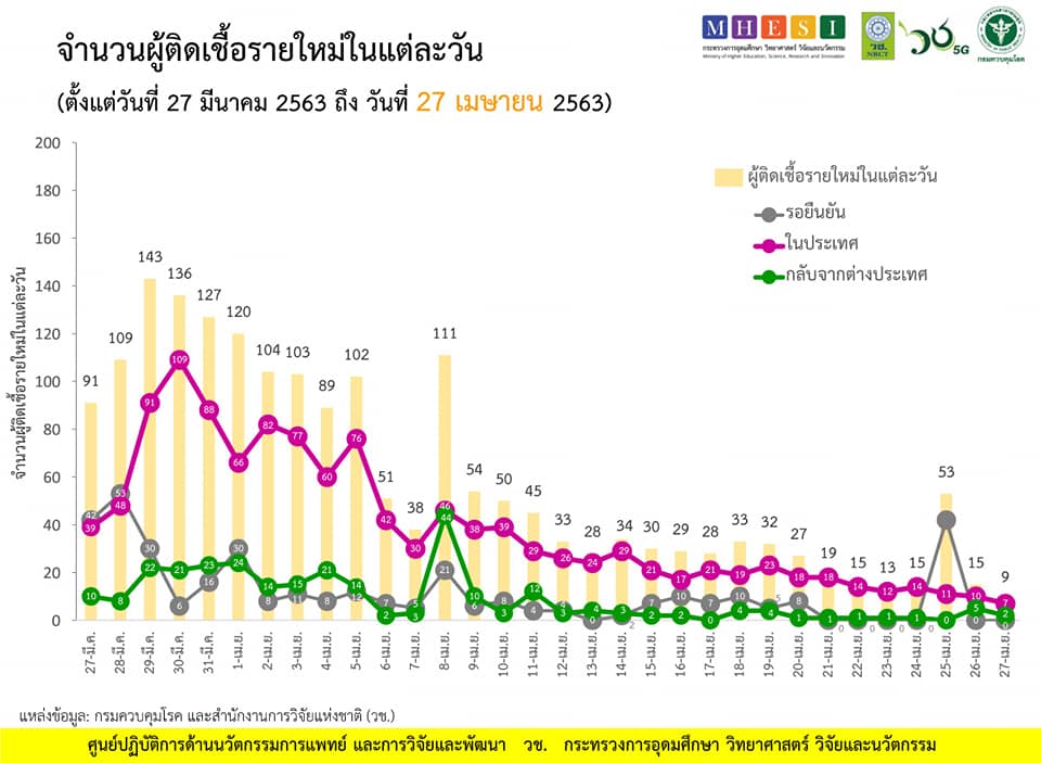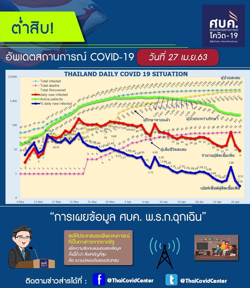 ยอดผู้ติดเชื้อรายใหม่ในวันนี้ (27 เมย.) ลดลงเหลือ 9 ราย ซึ่งเป็นยอดที่ต่ำกว่าสิบเป็นครั้งแรกในรอบหนึ่งเดือนครึ่ง (44 วัน ตั้งแต่ 14 มีนาคม จำนวน 7 ราย) และใน 9 รายนั้น เป็นครั้งแรกที่ไม่มียอดผู้ติดเชื้อในกรุงเทพ (จากต่างประเทศ 2 ราย ซึ่งอยู่ในสถานที่กักตัวของรัฐ)