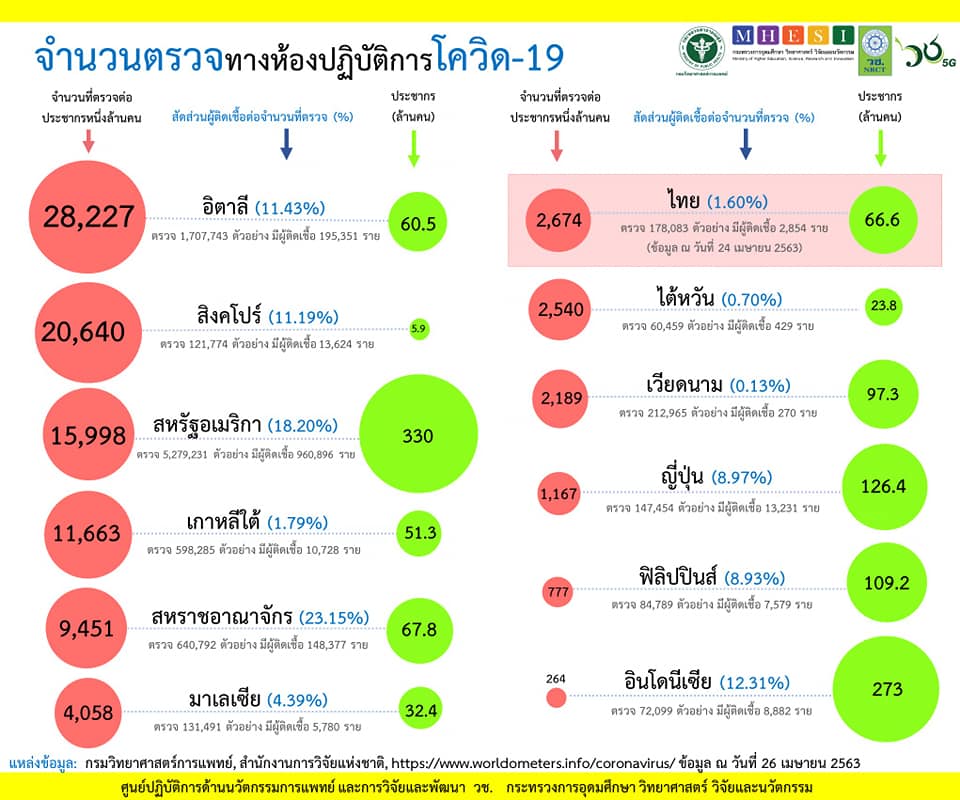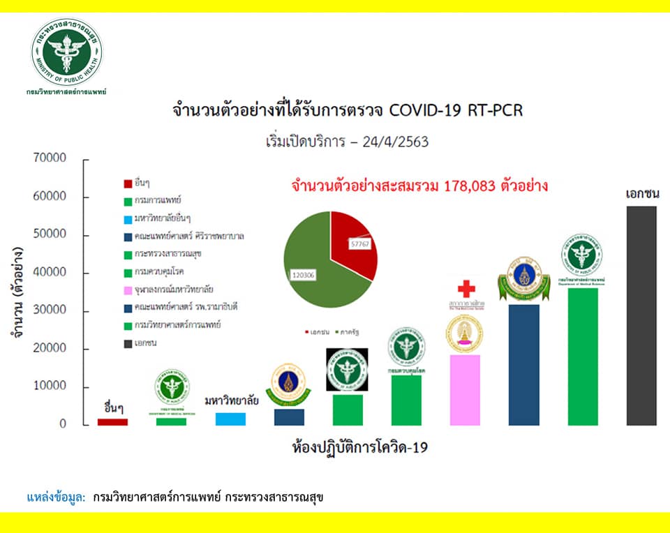ในระหว่างวันที่ 18-24 เมษายน 2563 ได้ตรวจไปแล้ว 26,242 ตัวอย่าง โดยห้องปฏิบัติการที่ได้รับการรับรองจากกรมวิทยาศาสตร์การแพทย์ 112 แห่งทั่วประเทศ