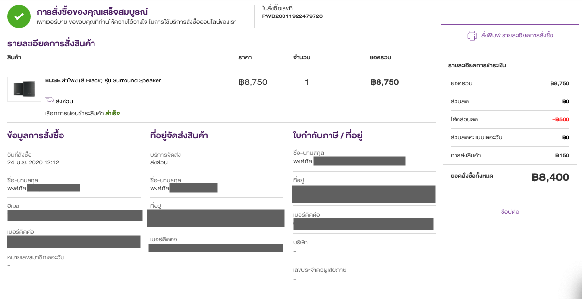 ผมสนใจเลยสั่งซื้อ เวลา 12.12น ทำรายการสั่งซื้อสำเร็จ ผ่านทางเว็บไซต์ PowerBuy ชำระผ่านบัตรเครดิต 0% 10 เดือน