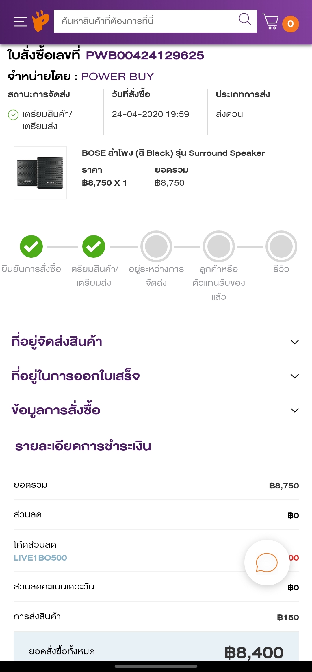 ตัวสินค้าราคา 8750 ใส่โค้ดลดราคา 500 บาท และเพิ่มค่าส่งด่วนอีก 150 บาท รวมยอด 8400 บาท