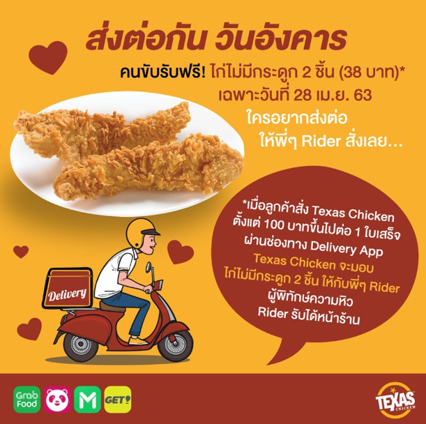 รับฟรีไปเลย ไก่ไม่มีกระดูก 2 ชิ้น (38 บาท) เฉพาะวันที่ 28 เม.ย.63 นี้เท่านั้น กับทุกๆ ออเดอร์ที่สั่งตั้งแต่ 100 บาทขึ้นไปต่อ 1 ใบเสร็จ ผ่านช่องทาง Delivery App ทางร้าน Texas Chicken Thailand จะมอบไก่ทอดร้อนๆ อร่อยๆ ให้พี่ Rider รับได้ที่หน้าร้านเลยคะ