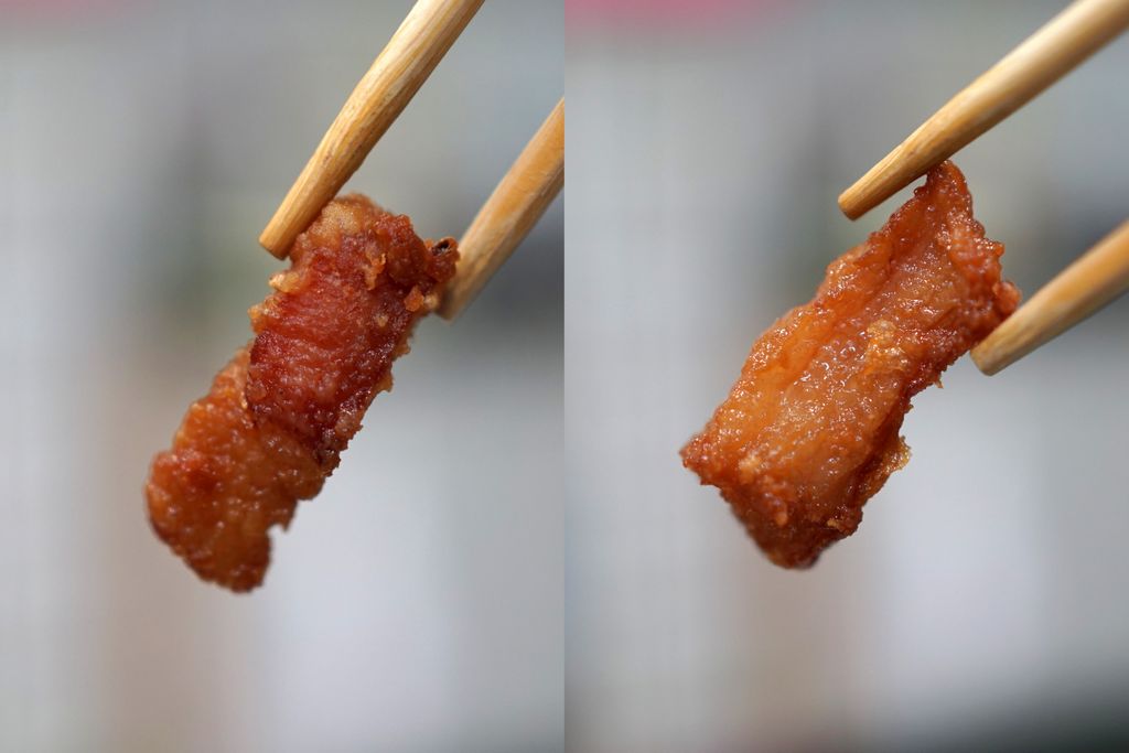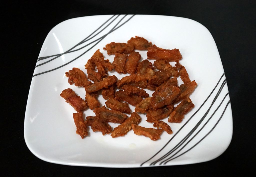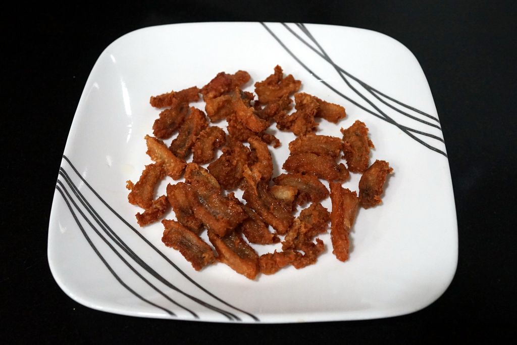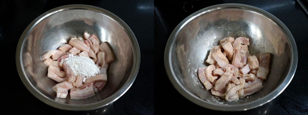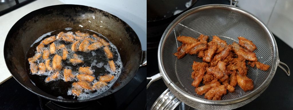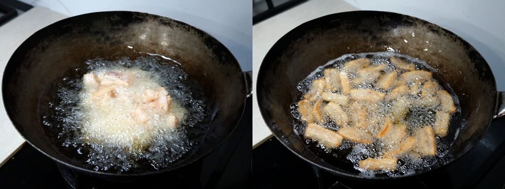 ตั้งกระทะใส่น้ำมันเยอะๆ พอน้ำมันเริ่มร้อน ใส่มันหมูที่หมักไว้ลงไป เอาตะหลิวเขี่ยให้กระจายอย่าให้ติดกัน ทอดไปจนเริ่มเปลี่ยนสี