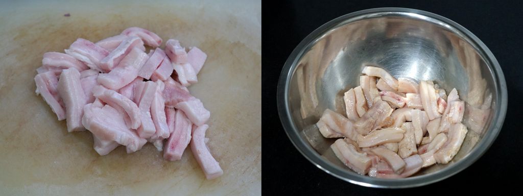 ครั้งนี้ทำหมูกระจกโดยใช้มันหมูแข็งล้วนๆ (ถ้าใช้หนังหมูติดมันหมูต้องนำไปต้มก่อนประมาณ 30 นาทีให้หนังหมูนิ่ม) หั่นเป็นชิ้นบางประมาณ 3 - 4 มม. นำไปหมักด้วยซีอิ้วขาว (หรือซอสถั่วเหลืองปรุงรส) เหล้าจีน