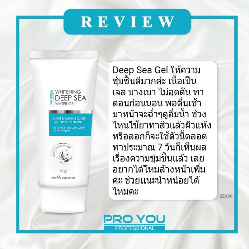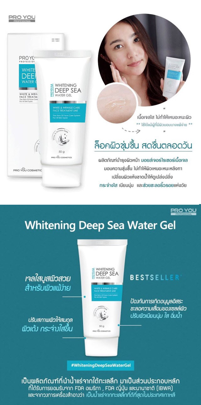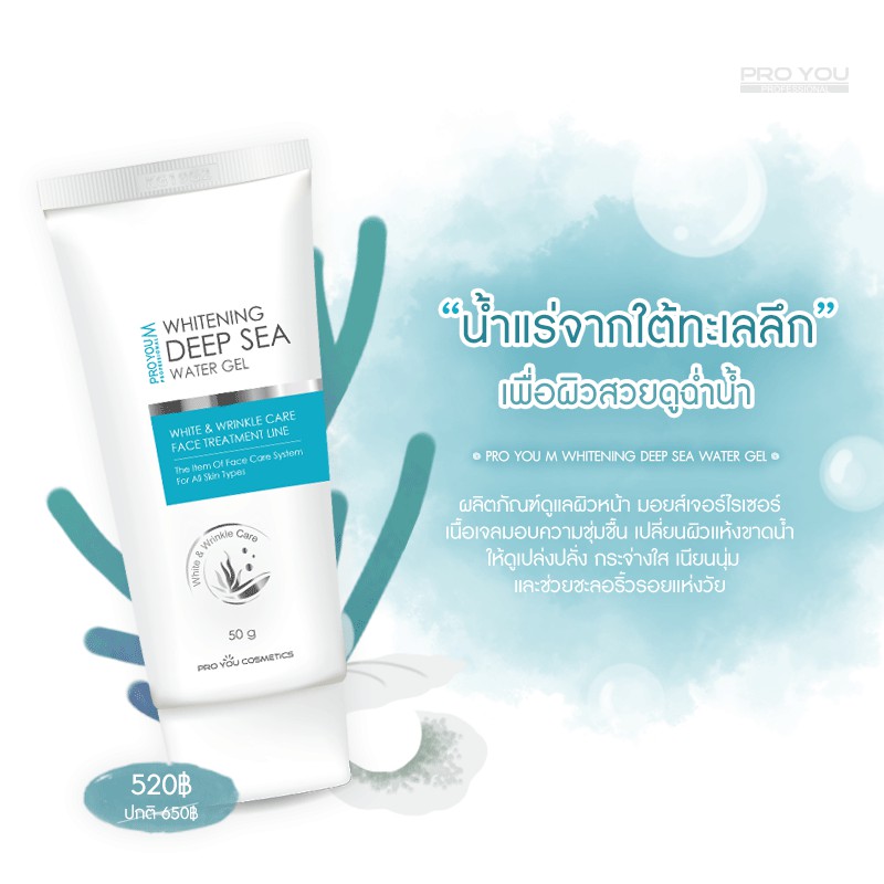 กระจ่างใสกับ Proyou M Whitening Deep Sea Water Gel #เจลใสหน้าฟู • สร้างความชุ่มชื้น เติมเต็มน้ำให้แก่ผิว • ยับยั้งการเกิดริ้วรอยแห่งวัย • ป้องกันการเกิดอนุมูลอิสระ จากความร้อนสะสมใต้ผิว ขนาด 50g ราคา 520.-