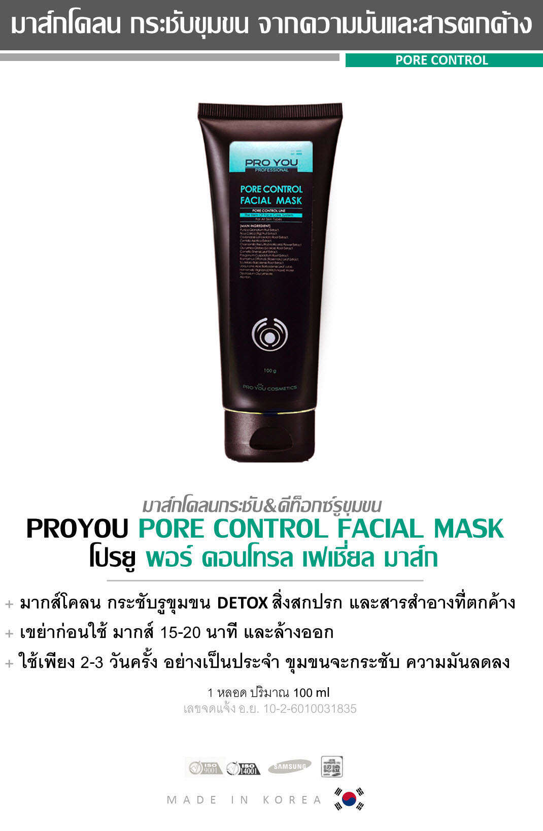 PROYOU PORE CONTROL MASK มาส์กโคลน กระชับรูขุมขน Detox สิ่งสกปรก และสารสำอางที่ตกค้าง เขย่าก่อนใช้ มากส์เพียง 15-20 นาที แล้วล้างออก ใช้สัปดาห์ละ 2-3 ครั้ง