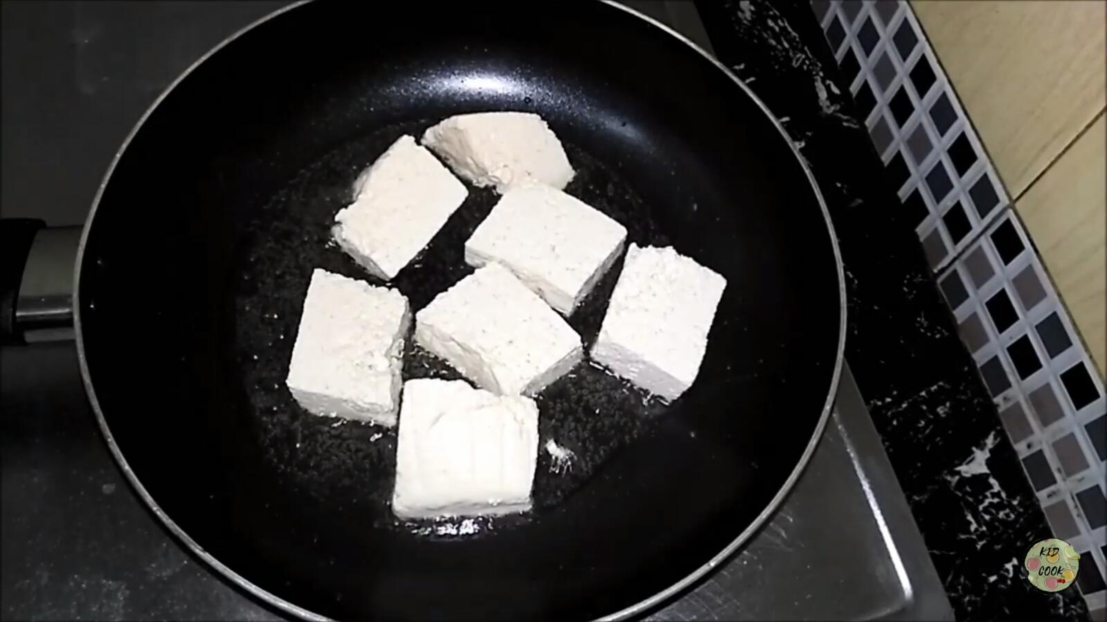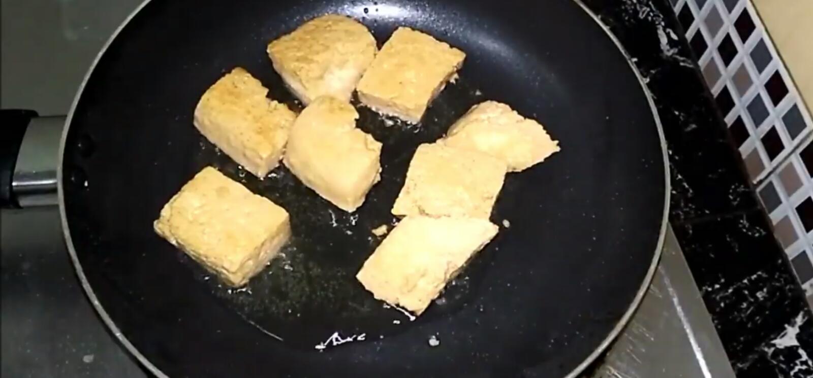 หั่นเต้าหู้ให้มีชิ้นที่เล็กลง ส่วนเต้าหู้ที่เหลือให้เปลี่ยนน้ำที่แช่เต้าหู้ปิดฝาเก็บในตู้เย็นไว้ทำเมนูอื่นต่อค่ะ นำกระทะตั้งไฟใส่น้ำมันนำเต้าหู้ลงทอดให้สุกเหลืองทั้งสองด้าน ตักขึ้นพักให้สะเด็ดน้ำมัน