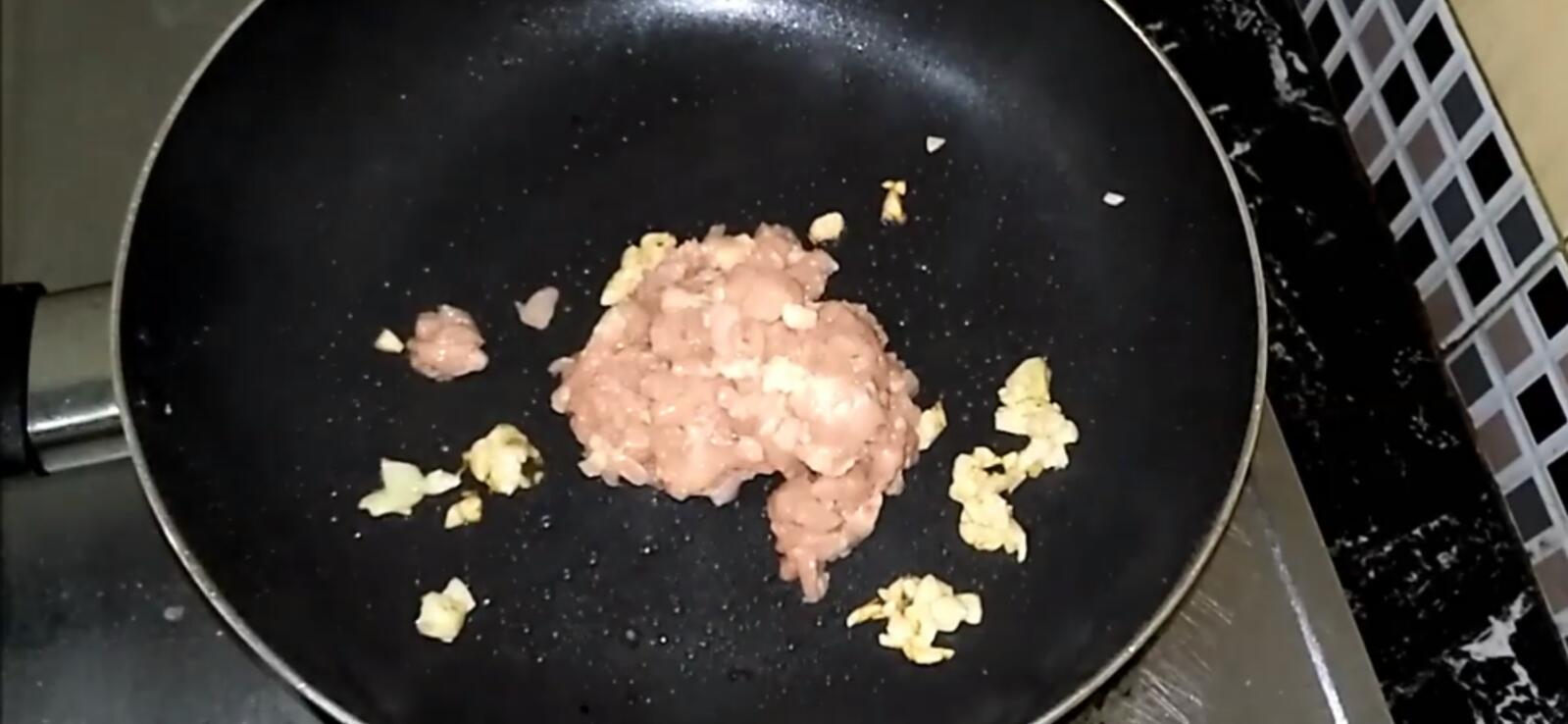 ตั้งกระทะใส่น้ำมันเล็กน้อยผัดกระเทียมจนสุกเหลืองแล้วนำไก่สับลงผัด