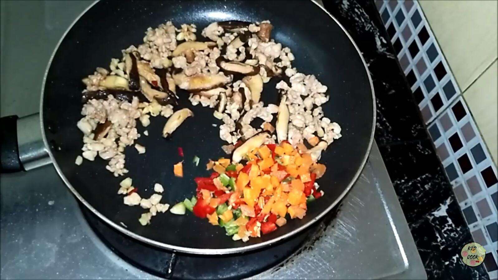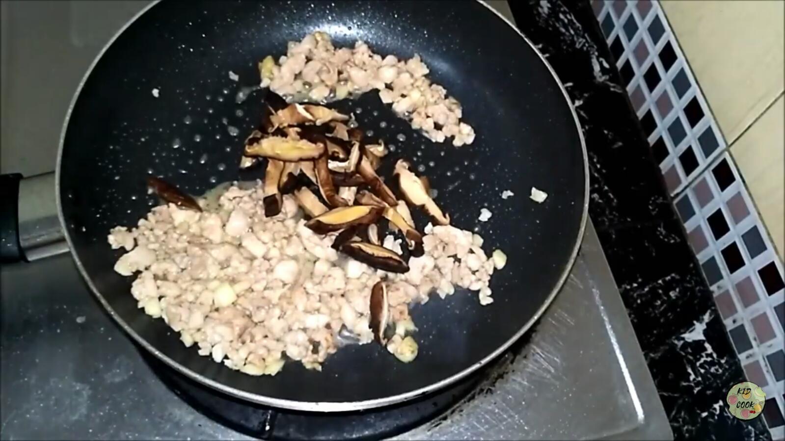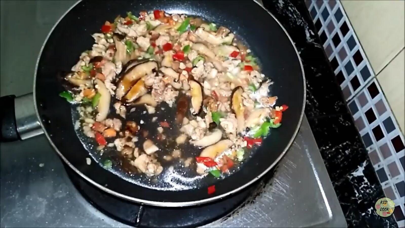 ไก่สุกแล้วนำเห็ดหอมที่แช่น้ำแล้วใส่ตามไป