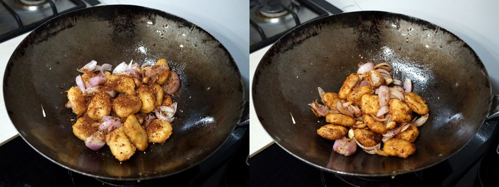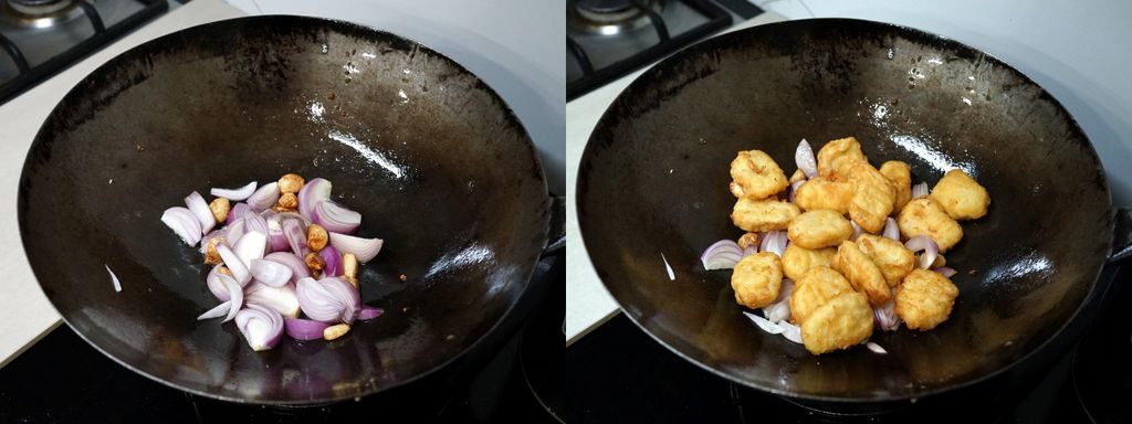 เอากระเทียมไปผัดกับน้ำมันจนผิวเกรียม ใส่หอมใหญ่ลงไปผัด ตามด้วยนักเก็ตไก่ที่ทอดไว้