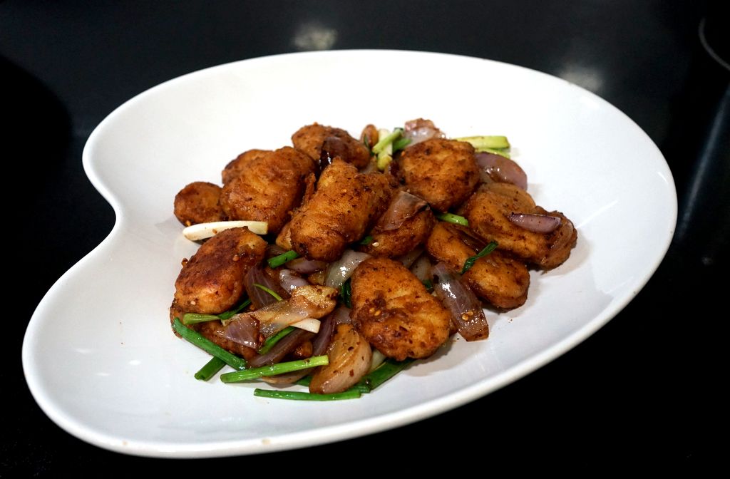 ซื้อนักเก็ตไก่แช่แข็งมาจากซูเปอร์ นำมาทอด แล้วนำไปผัดกับหอมใหญ่กระเทียม ปรุงรสด้วยผงหมาล่า