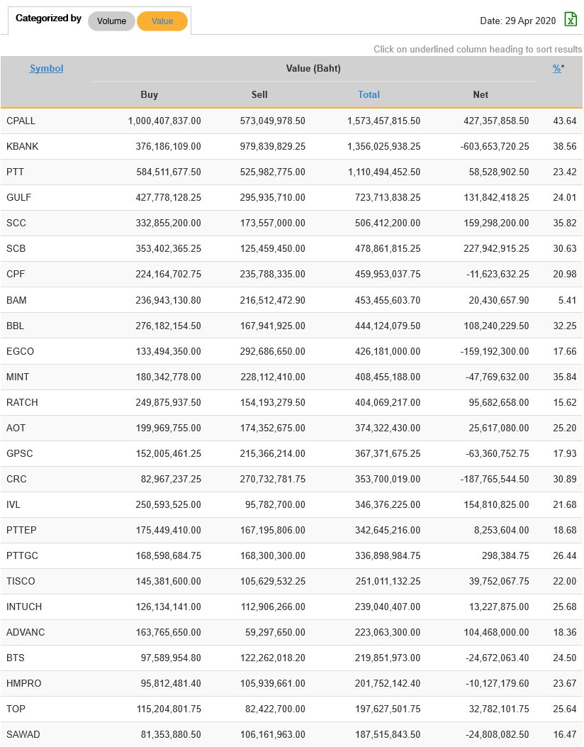 นักลงทุนต่างชาติ NVDR ซื้อ-ขาย มูลค่าสูงสุด 25 อันดับ 29/04/63