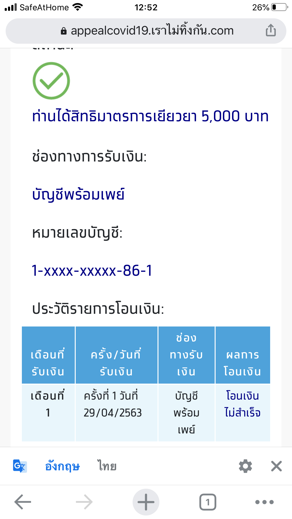 มีลูกน้องคนนึงลงทะเบียนขอรับการเยียวยาจากภาครัฐไป หลังจากการตรวจสอบแล้วได้รับสิทธิ มี sms แจ้งเค้ามาว่า "โอนเงินไม่สำเร็จ โปรดผูก / ตรวจสอบพร้อมเพย์บัตรปชช xxxx1234 เพื่อรับเงิน" ปัญห