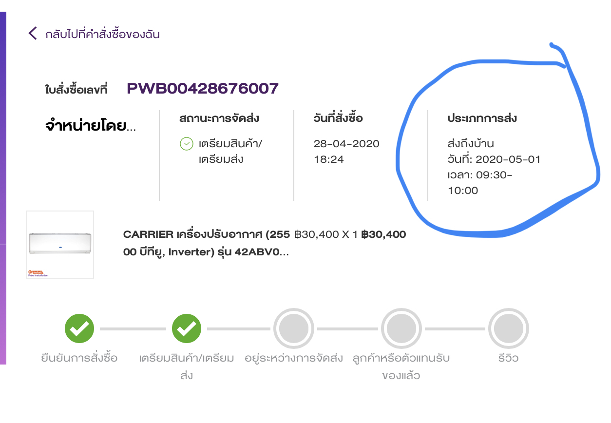 ผมทำการสั่งแอร์ ไปวันที่ 28/04/63 เลือกวันจัดส่ง 1/05/63 10.00 น ถึงเวลาไม่มีการติดต่อมาเงียบหาย
