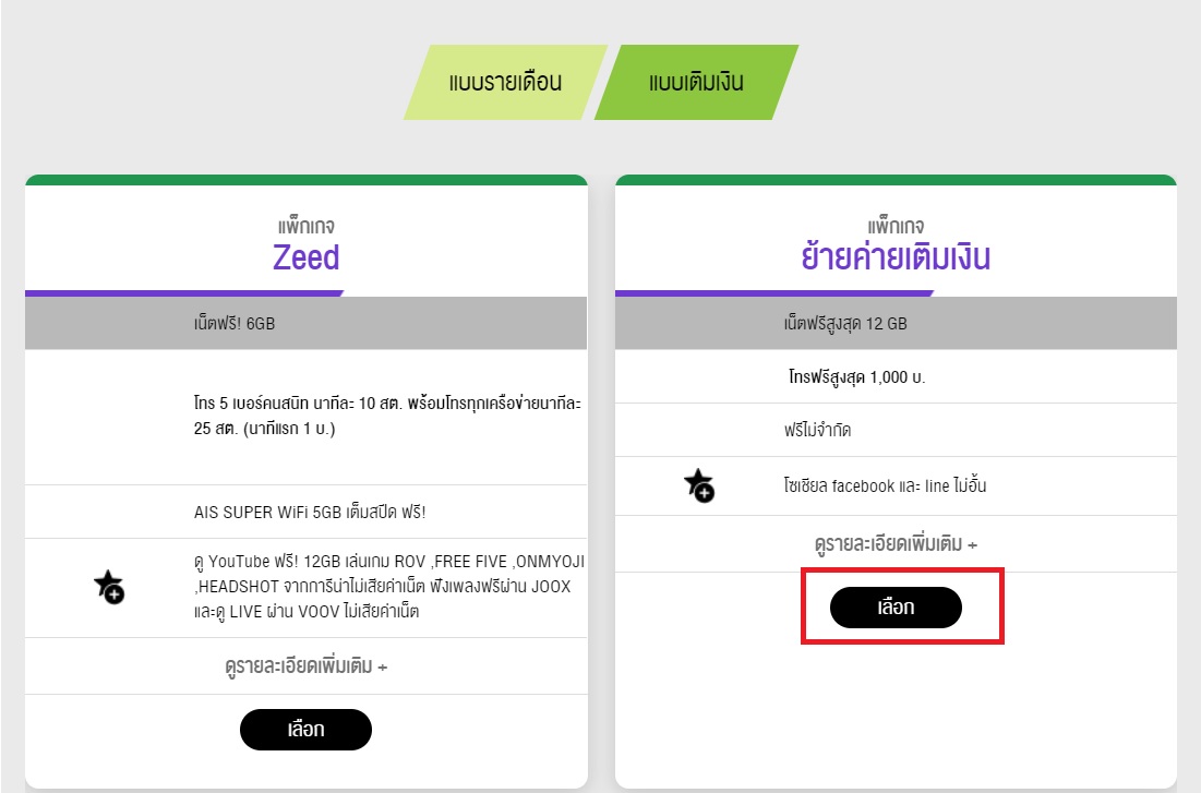 หน้าเลือกโปรโมชั่น -> ผมเลือกเติมเงิน โปรย้ายค่าย