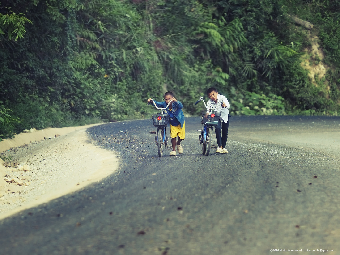 เด็กนักเรียนจูงจักรยานขึ้นทางเนินเขากลับบ้านไปกินข้าวตอนพักกลางวัน ที่เมืองเชียงขวาง สปป.ลาว
