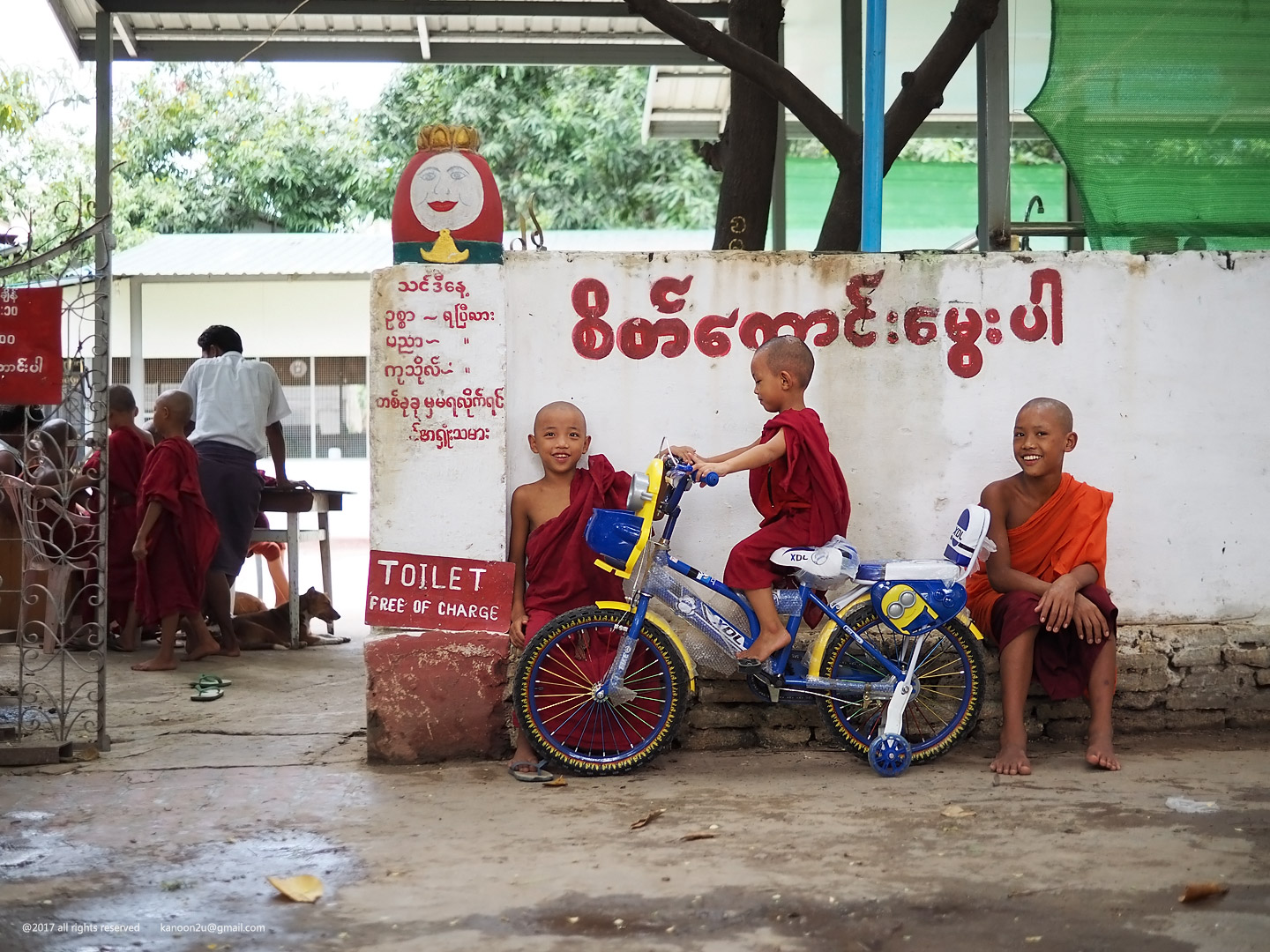 เด็กก็คือเด็ก เณรน้อยนั่งเล่นบนจักรยานอย่างมีความสุข ที่เมืองตองตะมาน ประเทศพม่า