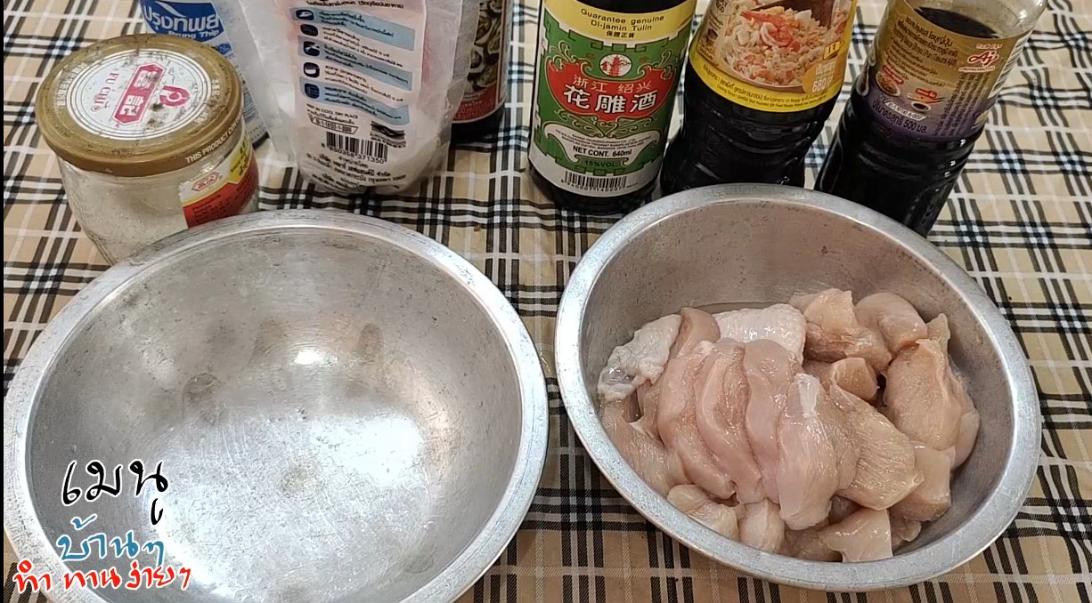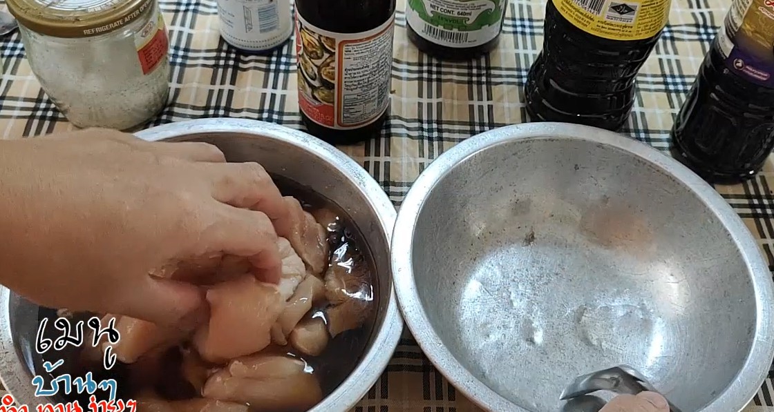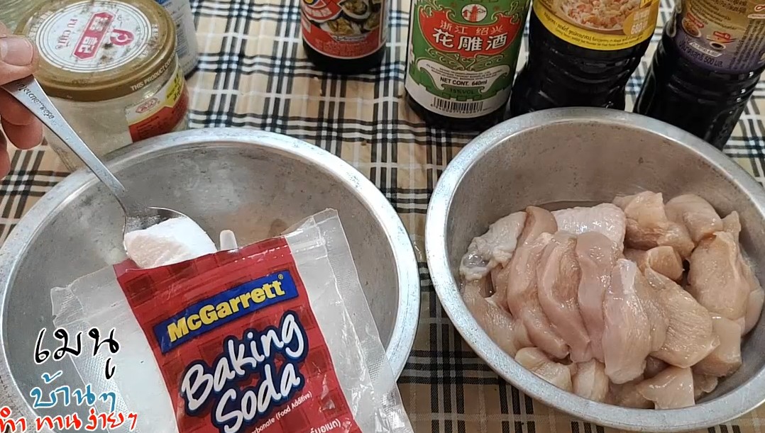 1.ผสมเบกิ้งโซดา กับน้ำคนให้ละลาย ใส่เกลือ,น้ำตาล และซอสทั้งหมดรวมถึงเหล้าลงไปคนให้ละลายเข้ากัน แล้วนำอกไก่ลงไปใส่ในชามผสมแล้วใช้ปลายนิ้วนวด สัก 10 นาที ตั้งทิ้งไว้ที่อุณหภูมิห้อง 1 ชั่วโมง จากนั้น ใส่น้ำมันพืช แล้วนำไปทำอาหารได้เลย แต่ถ้าอยากให้รสชาติเข้าเนื้อมากขึ้นก็แช่ตู้เย็นไว้ 1 คืน