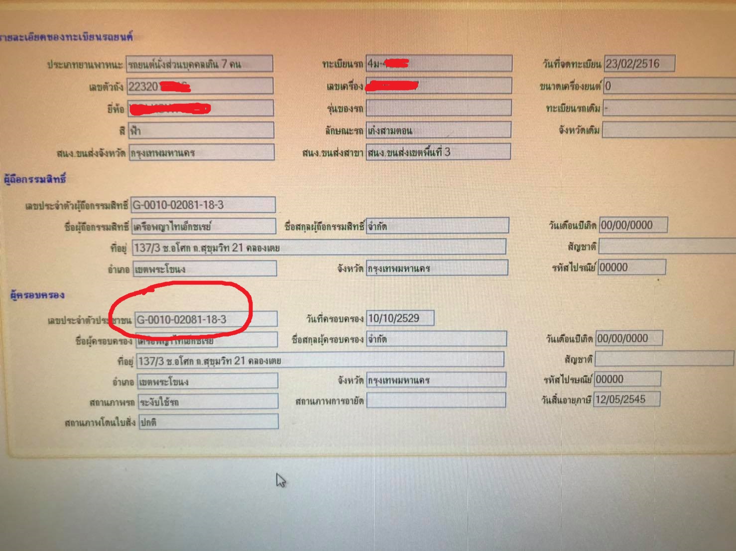 พอดีผมได้รถมา 1 คันจากการซื้อมาเป็นทอดๆ ไม่มีเอกสารอะไรเลย เเต่มีป้ายทะเบียนติดอยู่ของเเท้ ไปสืบๆมาได้ความดังรูปครับ เเต่เจ้าของเป็น รพ เลขที่บัตรประชาชนก็ไม่คุ้นตา อยากทราบว่าผมควรทำงัยเลขที่บัตรประชาชนเเบบนี้คืออะไร ขอบคุณครับ