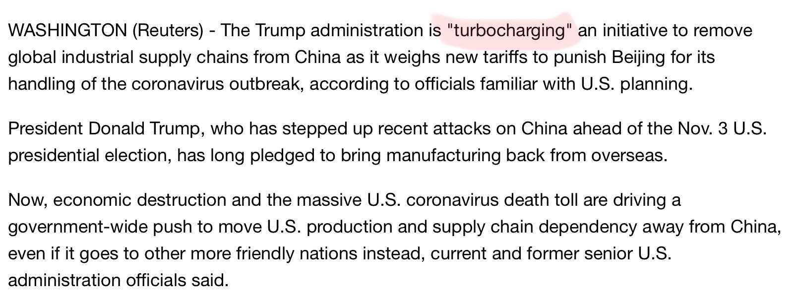 เมกาลงโทษจีน แบบเร่งด่วน "Turbocharging" พร้อมร่วมมือ ย้าย Supply Chain ไปยังพันธมิตร (ไม่มีไทย)