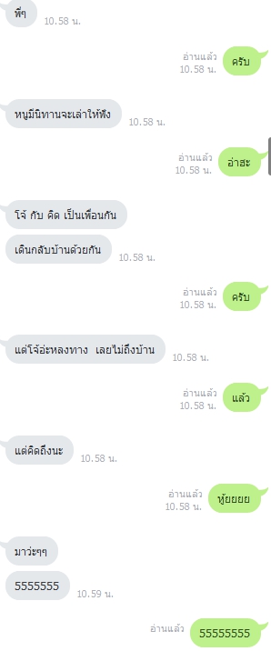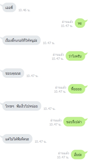 เหมือนตอนแรกจะแค่แซวกันเล่นๆ ไปๆมา ดันมาลงเอยด้วยประโยคที่ว่า "เล่นมากระวังคิดจริงนะ" น้องเค้าก็ตอบกลับมานะว่า นั่นสิ พอๆ ไปดีกว่า