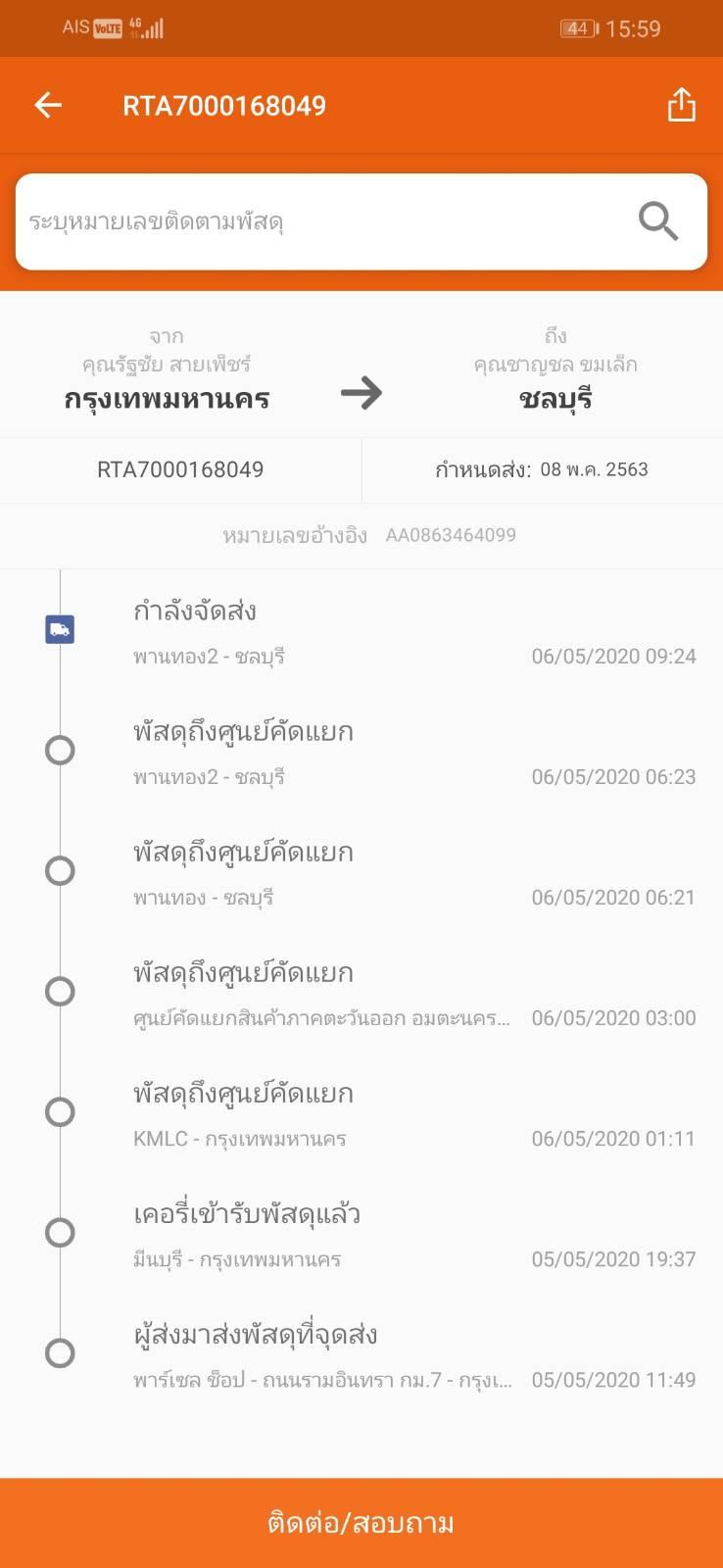 Kerry ผมส่งพัสดุจากชลบุรี ไป กทม.เข้าระบบตั้งแต่วันที่ 6 พ.ค. วันนี้ปาเข้าไปวันที่ 13 พ.ค. ยังค้างสถานะกำลังจัดส่ง ปลายทางยังไม่ได้รับ ทำไมถึงล่าช้าได้ขนาดนี้คร
