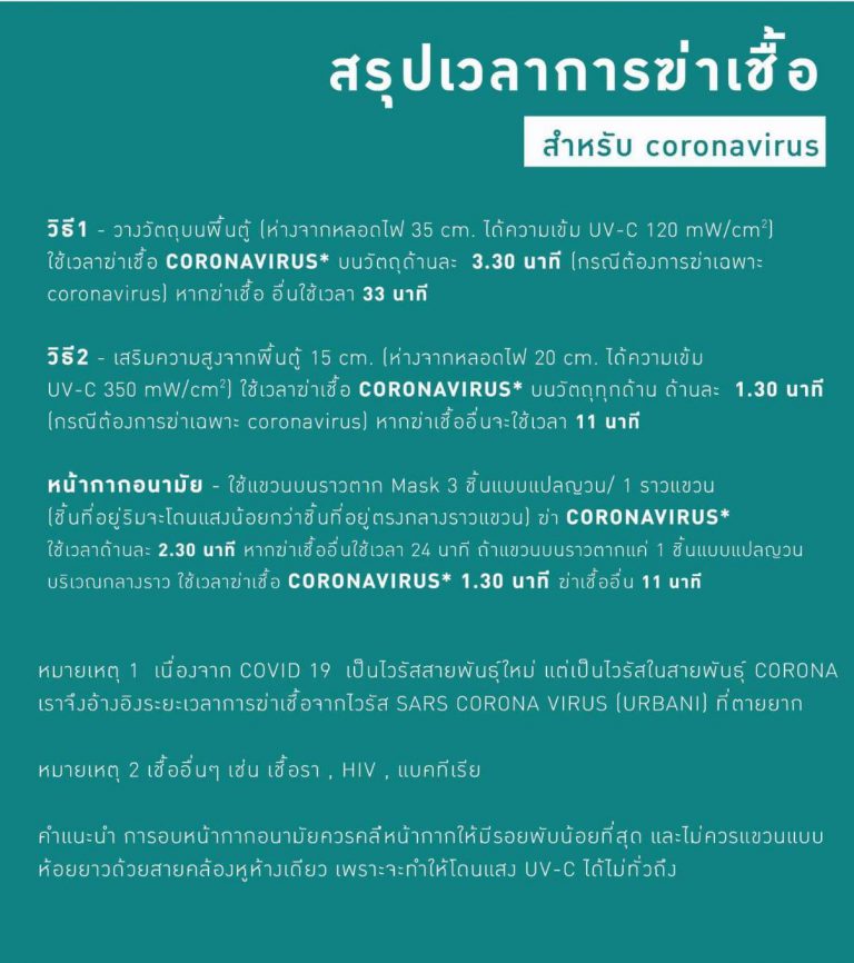 ด้วยนวัตกรรมของตู้อบฆ่าเชื้อโรค และเชื้อไวรัสที่สามารถฆ่าเชื้อไวรัสได้ด้วยรังสี UV มาตรฐานจากเยอรมันนีที่มีคุณภาพสูงจาก OSRAM ที่ฆ่าเชื้อไวรัส และแบคทีเรีย ได้สูงสุดถึง 99.9% โดยระบบภายในจะทำการฆ่าเชื้อด้วยแสง UV โดยใช้ระยะเวลาในการอบโดยประมาณ 15-30 นาที แต่หากสิ่งของที่ต้องการฆ่าเชื้อมีความหนาทึบ แนะนำให้กลับด้านเพื่อให้สัมผัสแสงอย่างทั่วถึงครับ