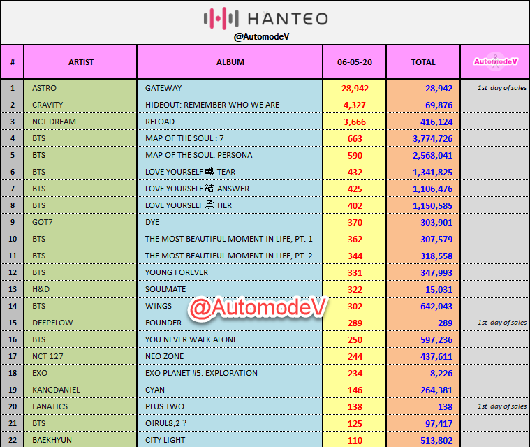 ยอดซื้ออัลบั้มจากชาร์ต HANTEO 6 พฤษภาคม 2563