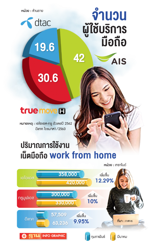 ด้านนายพิสุทธิ์ งามวิจิตวงศ์ ผู้อำนวยการอาวุโส ฝ่ายวิเคราะห์หลักทรัพย์ บริษัทหลักทรัพย์ กสิกรไทย จำกัด (มหาชน) กล่าวกับ “ฐานเศรษฐกิจ” ว่า ผลการดำเนินงานของกลุ่มสื่อสารในไตรมาสแรก ปี 2563 ยังมีการเติบโต โดย DTAC แจ้งกำไรสุทธิ 1,500 ล้านบาท เติบโต 16% ส่วน ADVANC คาดว่าจะประกาศในวันที่ 8 พฤษภาคม คาดจะมีกำไรสุทธิประมาณ 7,800 ล้านบาท เติบโต 3% และ TRUE คาดจะประกาศในวันที่ 15 พฤษภาคม มีผลขาดทุนสุทธิประมาณ 800 ล้านบาท แย่กว่าช่วงเดียวกันของปีก่อนที่มีกำไรสุทธิ 1,500 ล้านบาท