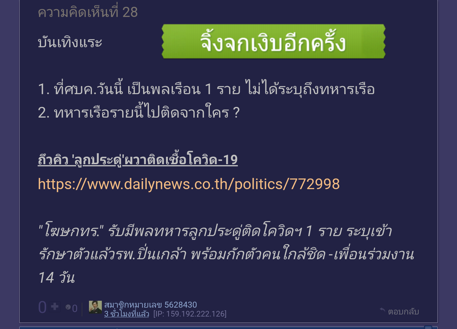 ❄มาลาริน/สงสารจิ้งจกจัง! เงิบอีกครั้งแล้วค่ะ...พลทหารทัพเรือไม่ติดโควิด