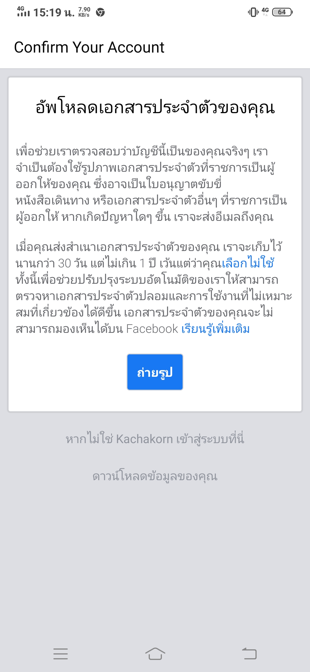 โดยผมถูกให้ยืนยันตัวตนของเฟสบุคโดยได้จัดส่งรูปถ่าย เอกสารใบขับขี่ และบัตรประจำตัวประชาชนให้ กดดำเนินการต่อ ทางเฟสบุคไม่ได้ส่งอีเมลล์ยืนยันมาให้ซึ่งปกติต้องส่ง เฟสบุคไม่ได้ถูกแบนหรือทำผิดกฎแต่แค่โดนให้แสดงตัวตน ซึ่งเข้าเฟสบุคจะขึ้นมาหน้านีตลอด ตั้งแต่วันที่5/5/63 ที่โดนให้ยืนยันอยากทราบว่าเกิดจากวาเหตุอะไร ตอนนี้เซงมากเฟสบุคปกติใช้ชื่อจริงและตามด้วยชื่อเล่น ใครเคยโดนแบบนี้บ้างและมีแนวทางในการติดต่อเจ้าหน้าที่ไหม มีความจำเป็นต้องใช้เฟสบุคติดต่องานเฟสนี้เล่นมาน่าจะเกิน10ปี และมีเพจที่คนกดติดตาม5000คนอีก ถ้าไม่ได้คืนคงเซงมาก