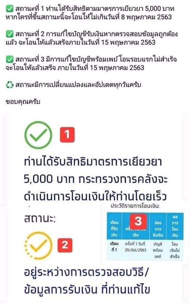 เมื่อวันที่29 เมษายน 2563 ผมได้เช็คข้อมูลผ่าน เราไม่ทิ้งกัน เงินเยียวยา5000 บาท และได้รับสิทธิ์ เขาบอกในว่า ทำการโอนเงินสำเร็จแล้ว แต่พอเข้าไปในแอพธนาคาร ไม่มีเงินเข้าสักบาท -ผมได้เช็ค พร้อมเพย์ กับ เ