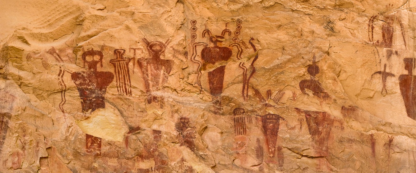 (ภาพวาดบนผนังถ้ำจากรัฐยูทาห์ (Utah) สหรัฐอเมริกา อายุประมาณ 7,500 ปีที่แสดงภาพของมนุษย์ประหลาด ผิวสีแดงมีดวงตากลมโตผิดปกติ บางคนดูเหมือนสวมหมวก บางคนมีเสาประหลาดโผล่ออกมาจากศีรษะ Cr.